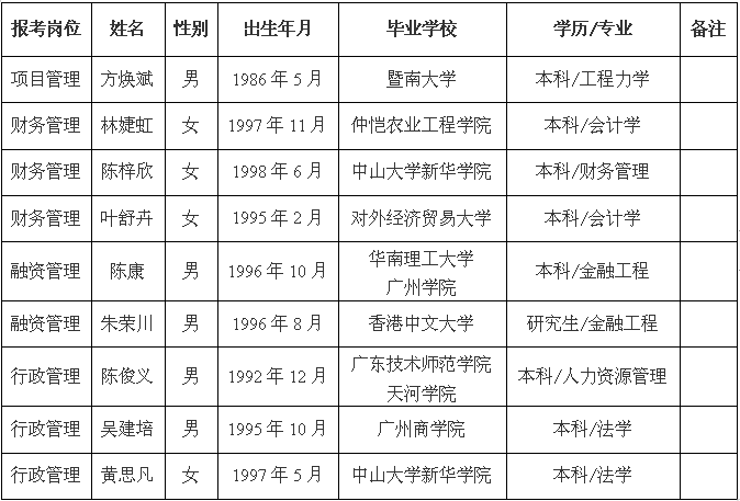 根據(jù)揭陽市投資控股集團(tuán)有限公司的委托,我公司經(jīng)組織報(bào)名、資格審查、筆試、面試、體檢、政審等程序,現(xiàn)確定下列人員為揭陽市投資控股集團(tuán)有限公司擬聘用人員并公示如下: