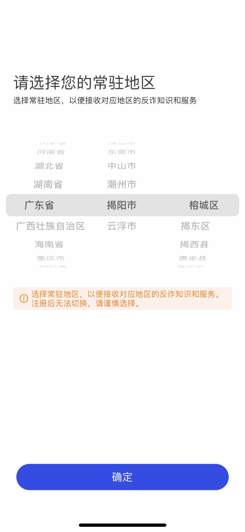 2、進(jìn)入APP后,首先選擇常駐地區(qū)完成注冊(cè),然后進(jìn)入登錄頁面,點(diǎn)擊“快速注冊(cè)”。完善個(gè)人賬號(hào)信息后并保存。